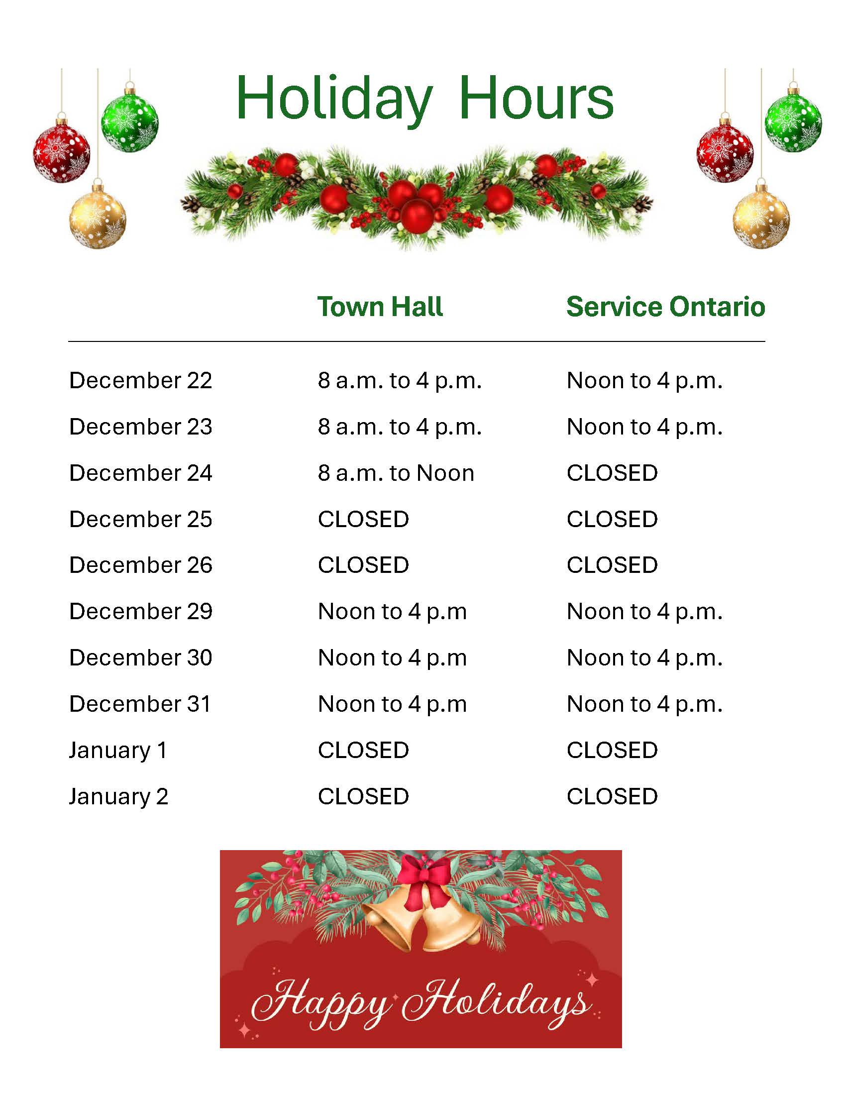 Town Hall - Monday to Friday, 8 a.m. to 4 p.m.